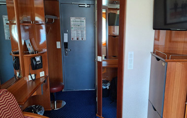 The photo above is taken from Kiel station, you can see how close the ferry is, a 5-6 minute walk across the harbour. There's a lift up to a connecting walkway which takes you to the ferry terminal. If you've reserved one of Color Line's 5 star suites, check in at the desk rather than the machines to be directed to a VIP lounge with free tea, coffee, juice, snacks & WiFi. You'll have priority boarding & free access to the on-board spa. Photos courtesy of Philip Dyer-Perry except where shown.