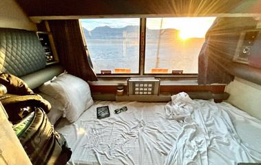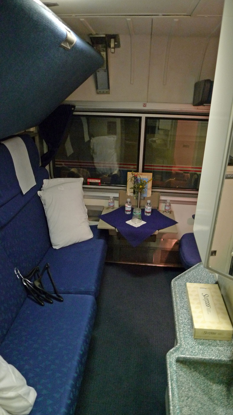 Superliner Roomette. The photo shows its size, just big enough for two comfy seats facing each other. At night, the seats pull together to form the lower berth, which takes up most of the room, the upper berth folds out from the wall above the window. Washrooms, toilet & a hot shower are just along the corridor. See panorama photo. This shows a 2024 refurbished sleeper with the new leather seats. Photos courtesy of Rebecca Fletcher.