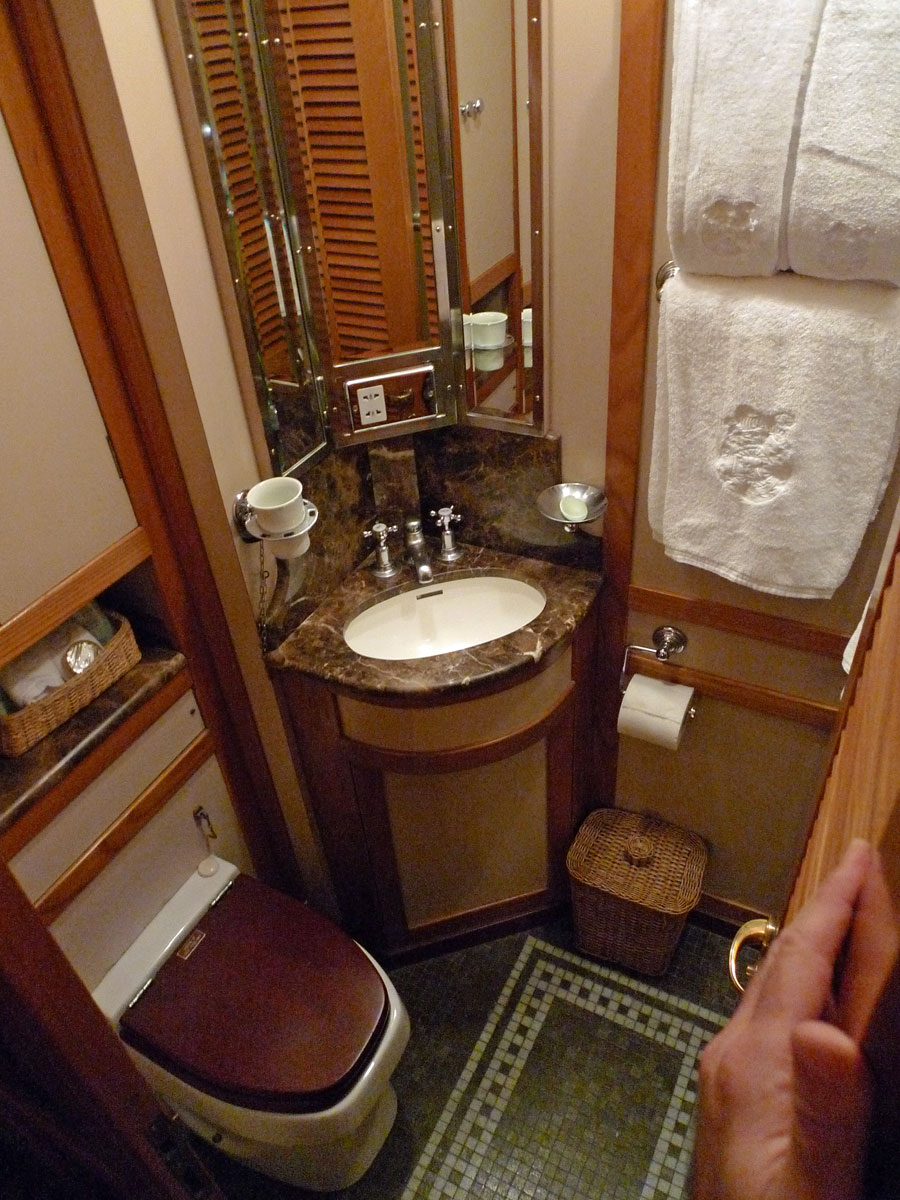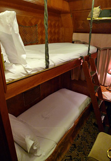 Option 2: Staterooms. A Stateroom gives you double the floorspace of a Pullman, with a sofa, armchair and freestanding chair by day. While you are at dinner, the steward converts your compartment to two lower beds (so no ladder required!). As in a Pullman, there's a small en suite washroom with toilet, washbasin & shower, and UK-style sockets allow you to recharge your camera, phone or laptop. Click the images for larger photos.