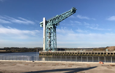 Panorama photo of the fitting-out basin, with the Titan crane at the far end, college (and former main slipway) on the left.