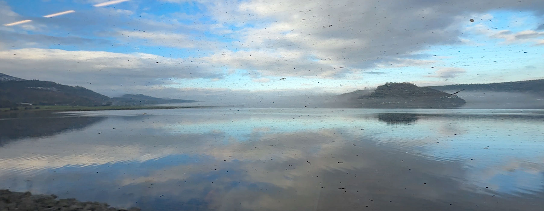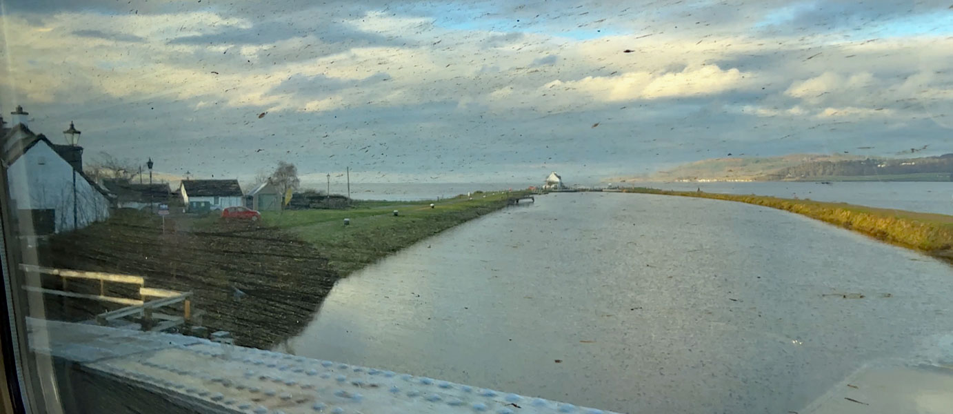 Above, the January Sun gives way to mist. At Dornoch Firth, the A9 road crosses on an infamous modern road bridge built without provision for the railway. The trains have to head inland to go around the end of the firth.