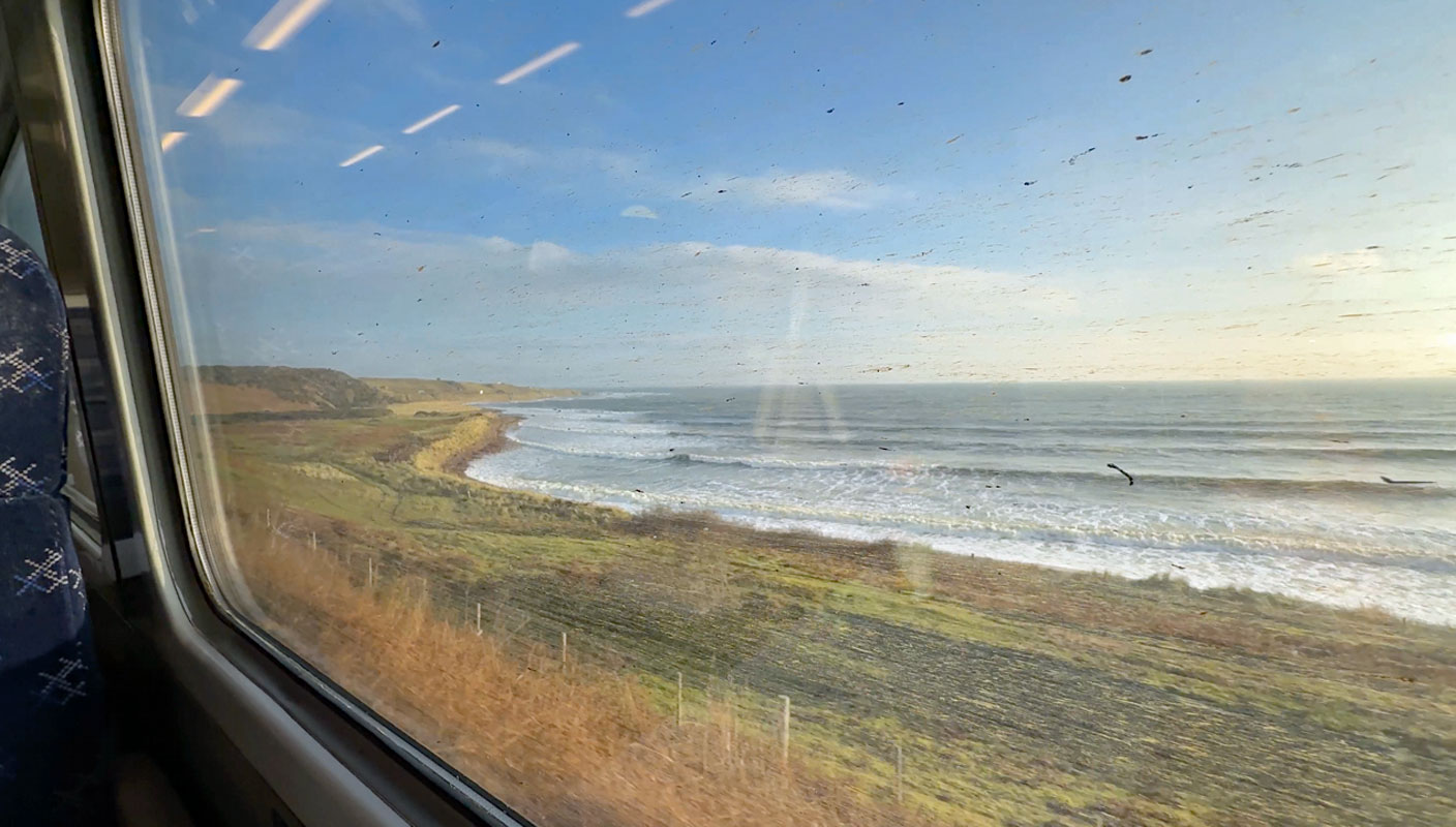 Above left, running alongside the North Sea. Above right, a welcome visit from the refreshment trolley.