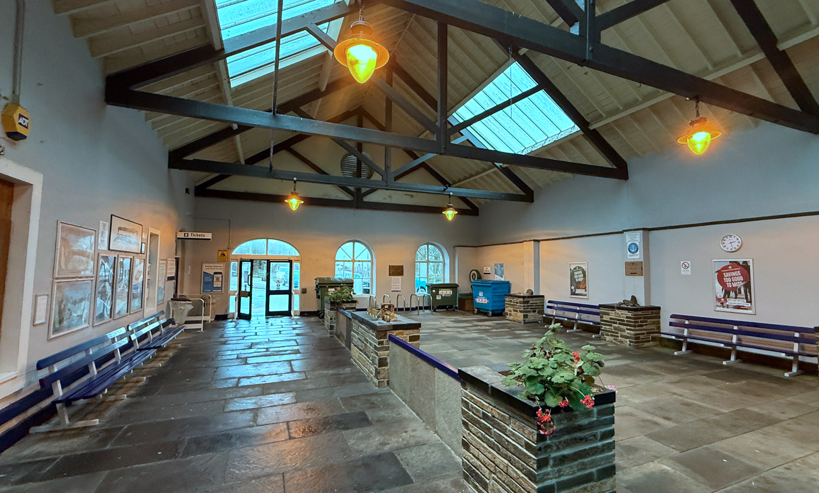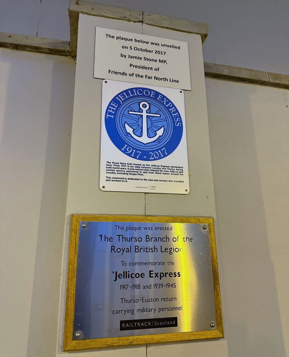 Thurso, Britain's most northerly railway station. Above right, plaques commemorating the Jellicoe Express in the main hall.