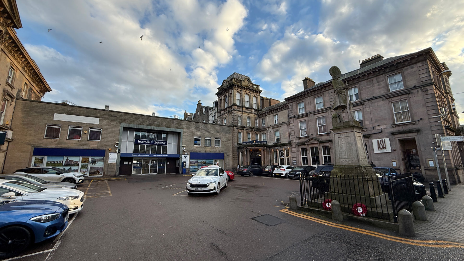 Above, Inverness station and next to it to the right, the Royal Highland Hotel.
