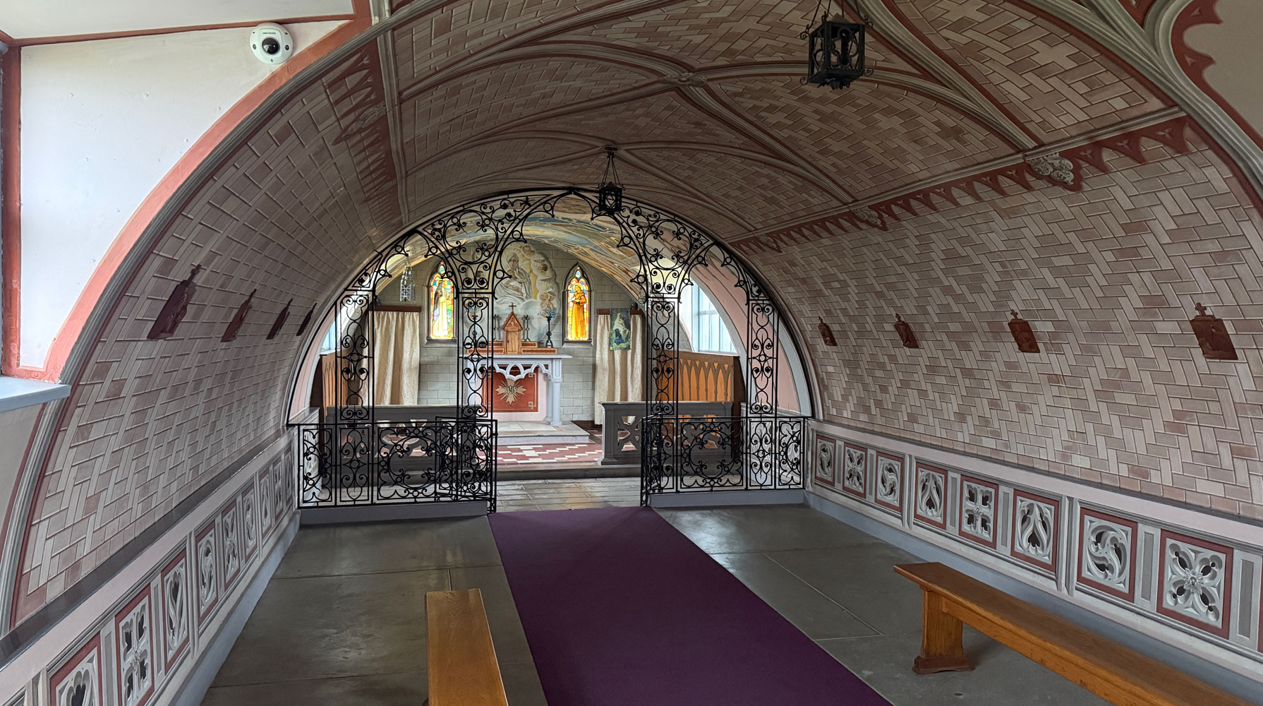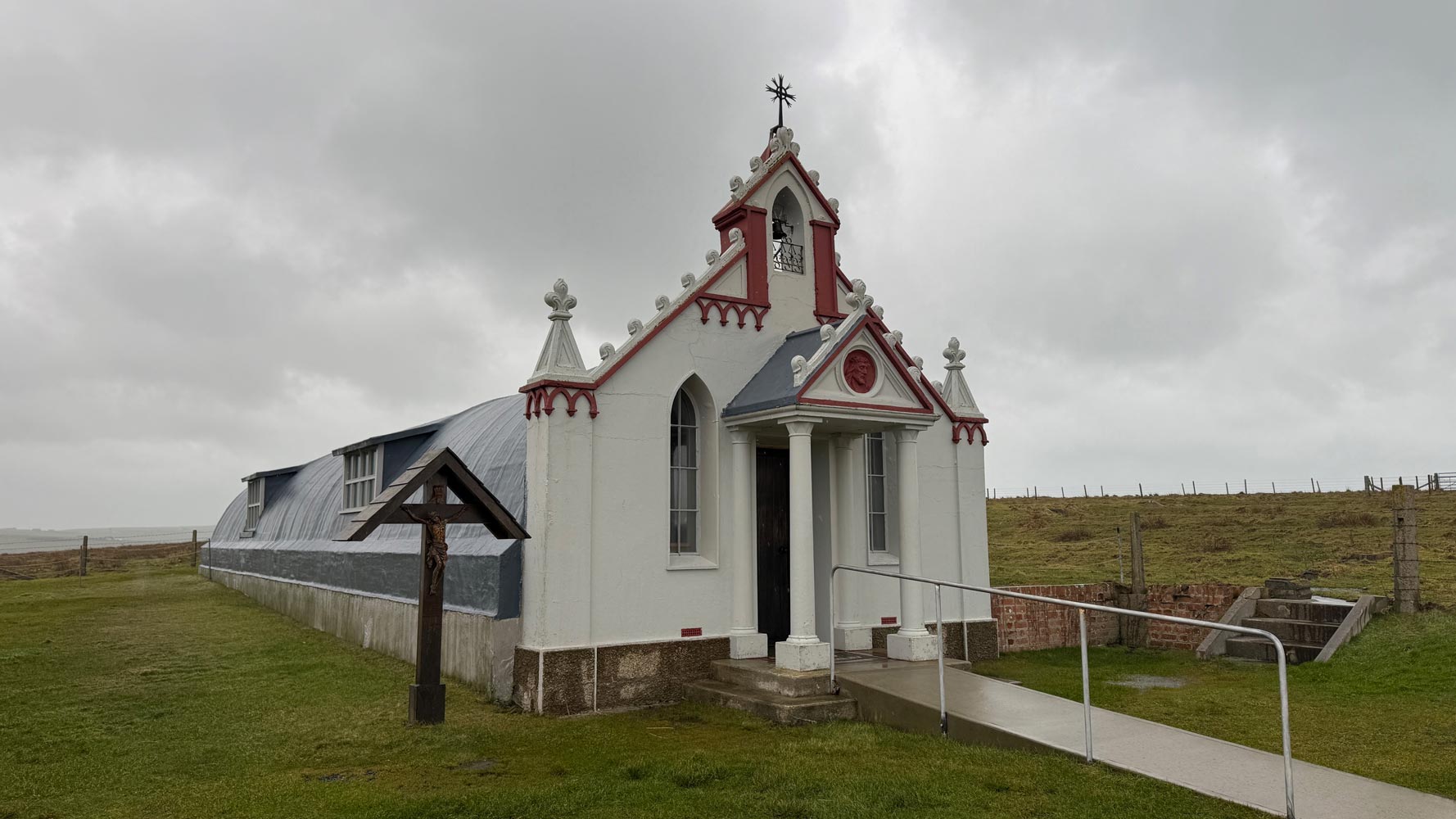 The Churchill Barriers were built with the help of Italian prisoners of war who had been captured in North Africa and taken to Orkney. Housed in a camp on the islet of Lamb Holm, a number of them converted two Nissen huts into an exquisitely-painted chapel. You can still see the foundations of the PoW accommodation blocks to the right of the chapel. See www.orkney.com/listings/the-italian-chapel.