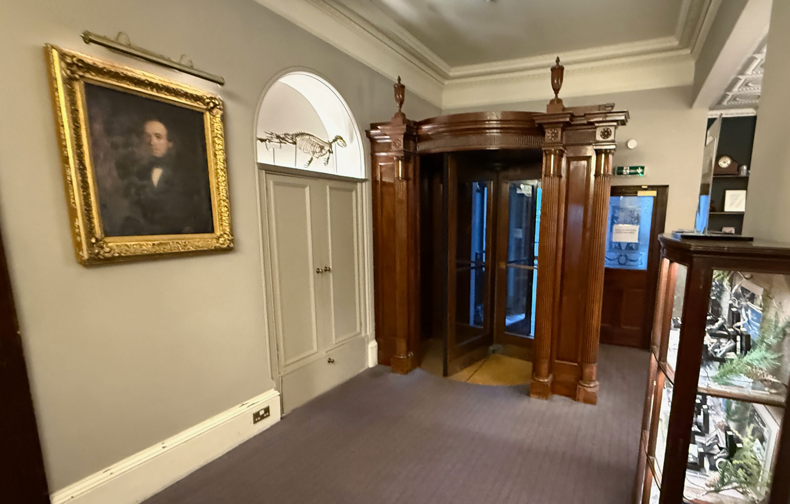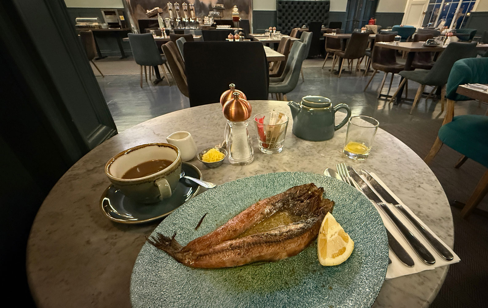 Below left, the hotel's classic revolving door. Below right, the perfect breakfast kipper.