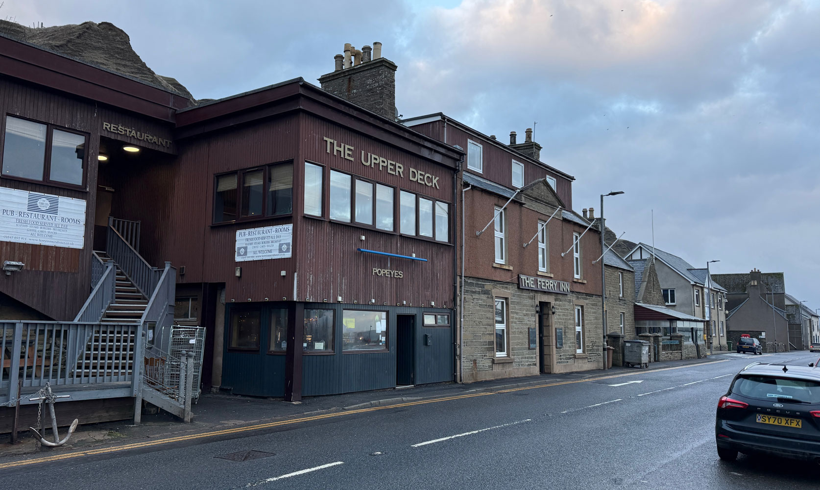 Above, Stromness ferry terminal in daylight. Taken from the main street in Stromness, 2 minutes' walk from the Royal Hotel.