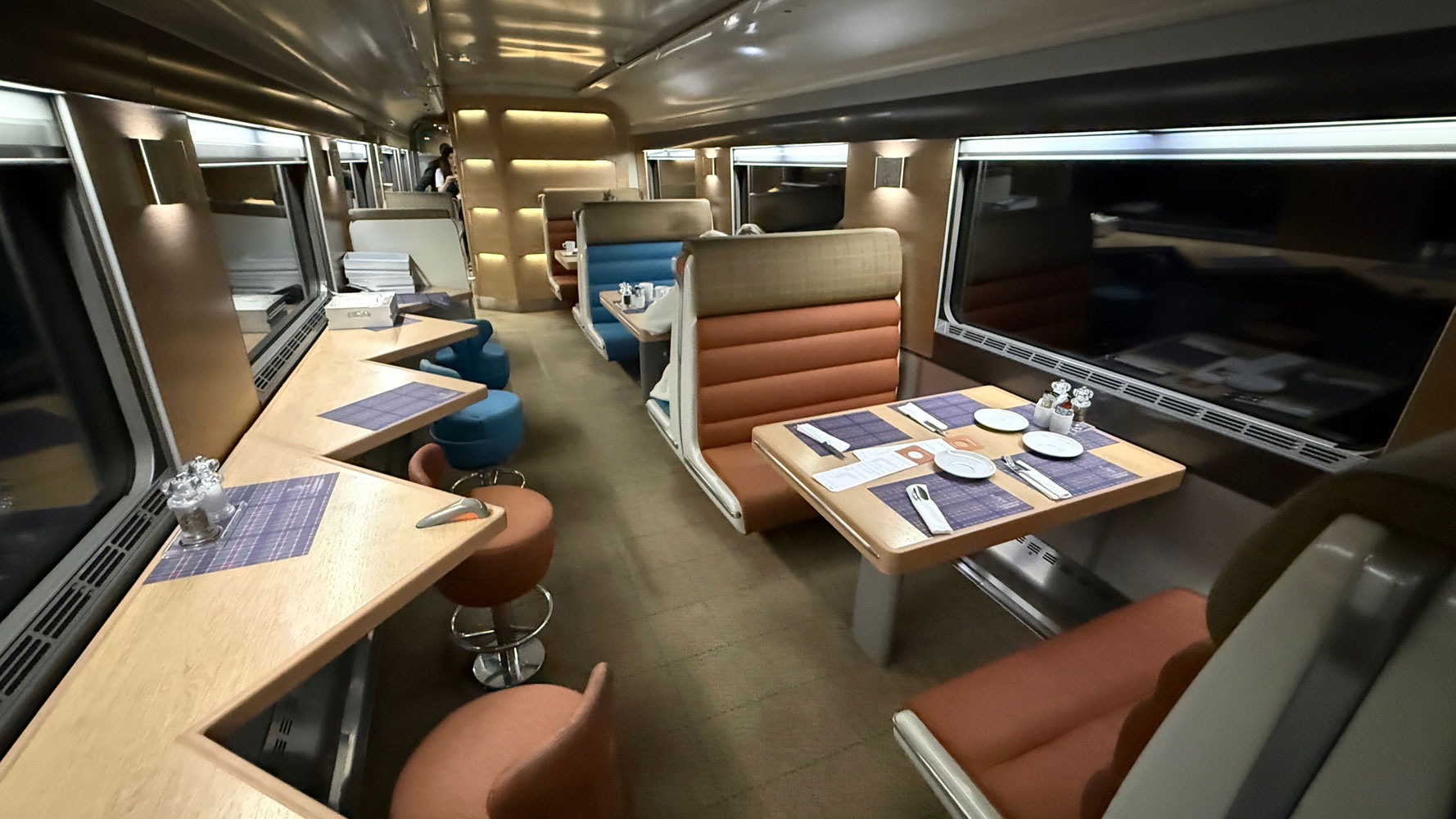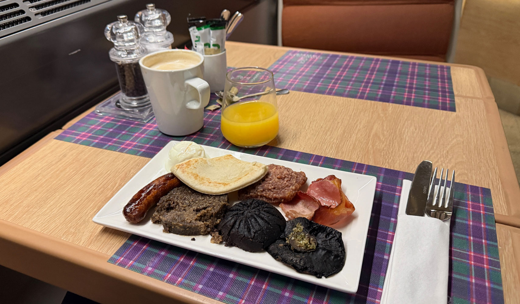 Scottish breakfast in the club car next morning (above left). Above right, the Caledonian Sleeper lounge in Inverness.