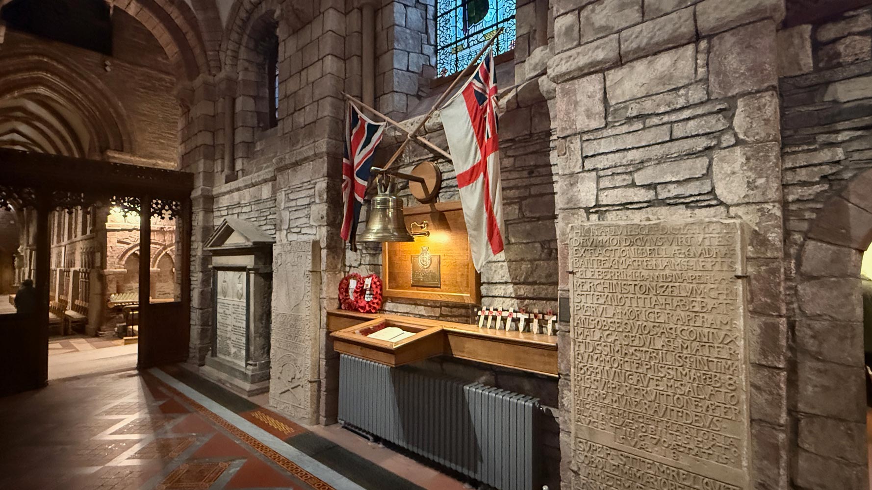 Above left: Inside St Magnus Cathedral. Above right: The Royal Oak memorial and ship's bell, raised from the wreck.