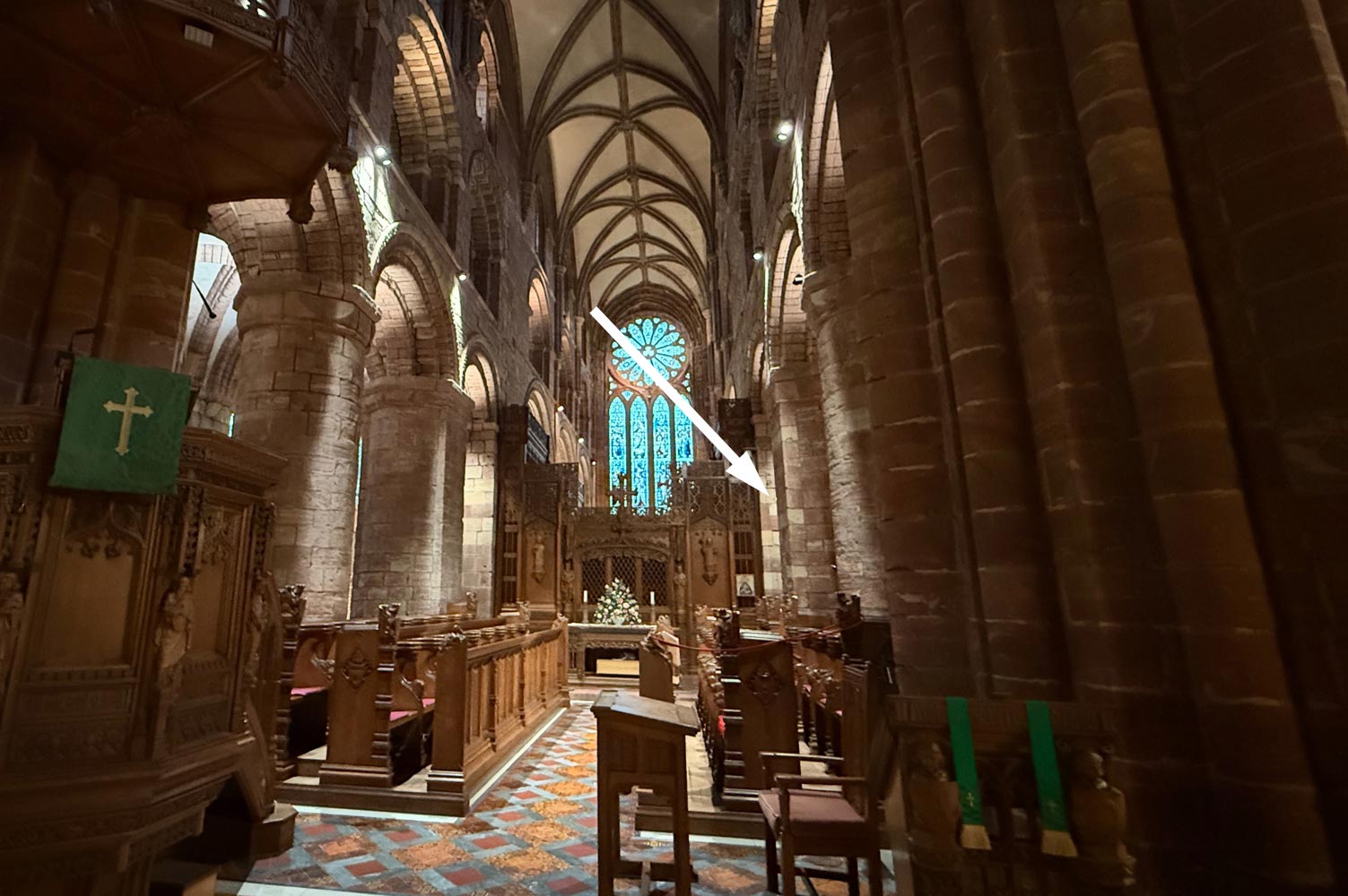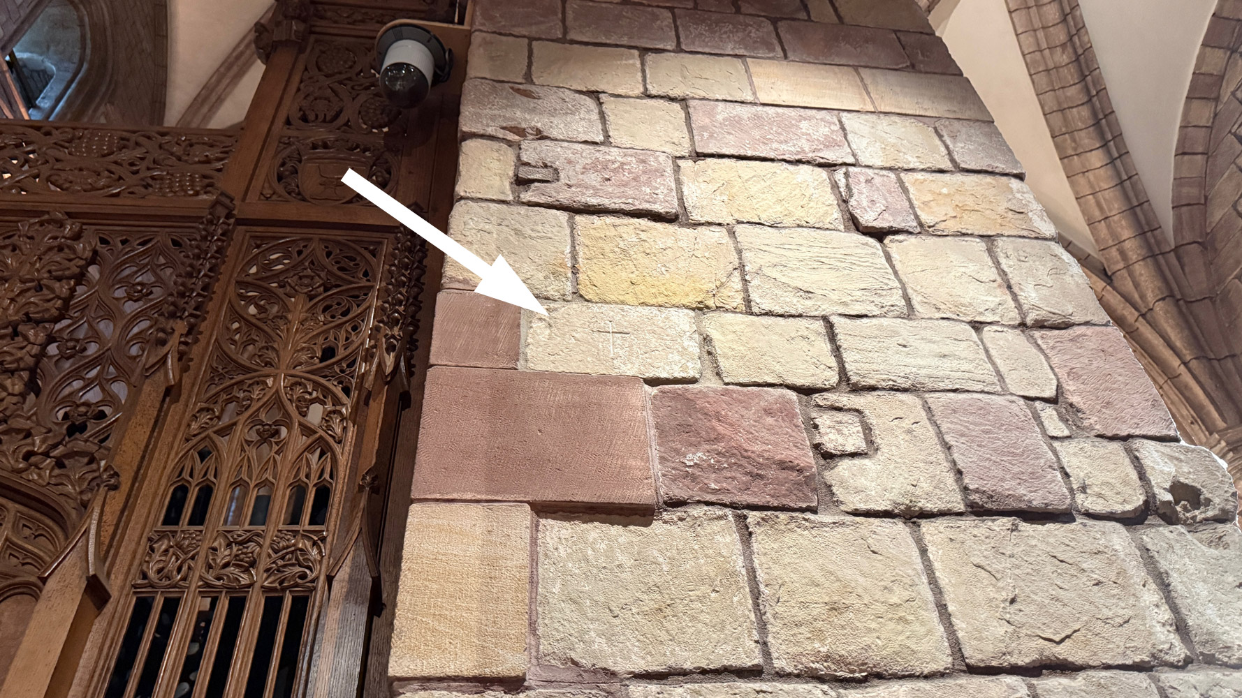 Above: In 1919, bones believed to belong to St Magnus were found hidden behind one of the stones in this pillar, the stone with a small cross carved on it. The bones were placed back behind this stone in 1926 and remain there to this day. Story of Viking Earl & martyr St Magnus.