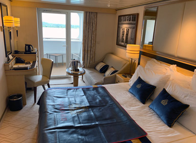 The Queen Mary 2 towers high above the terminal. Check-in is usually 13:00-15:45, and she sails at 17:00. Settle into your stateroom or suite, then head up on deck for departure. |