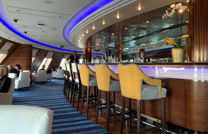 Sponsored by Veuve Cliquot, the Champagne Bar is on 3 Deck, on the upper level of the Grand Lobby in the centre of the ship.