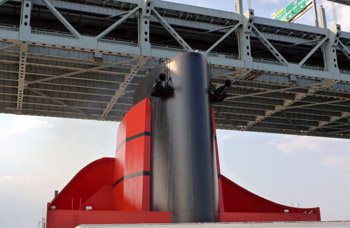 Inches to spare. The QM2's funnel inches under the Verrazano narrows bridge with just 10 feet to spare. Incidentally, one of the QM2's two funnel-mounted Tryfon horns (the starboard one) is borrowed from No.2 funnel on the original Queen Mary, the QM2's other horn is a modern copy. |