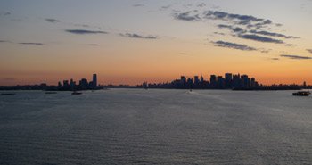 Dawn over Manhattan! Once under the bridge, that famous New York skyline comes into view. |