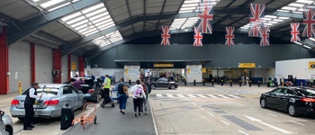By taxi from station to terminal: On arrival at the terminal, your big bags are whisked away. These photos show the QEII Terminal, she can also use the City Terminal, the Mayflower Cruise Terminal or the Ocean Terminal. |
