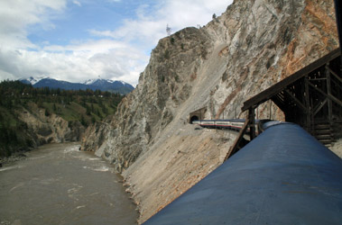 11:55 Avalanche alley (above right): The Rocky Mountaineer travels at the very edge of the river under a sheer cliff wall with avalanche protection sheds in several places. One section of the rock wall is attractively coloured, known as 'rainbow canyon'.
