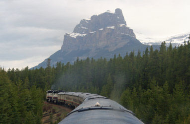09:30 Castle Mountain (above right): On leaving Banff, the train winds through the pine trees along the Bow River, with snow-capped mountains on either side of the broad valley. Look out for the impressive and imposing Castle Mountain to your right, around milepost 99. It's an appropriate name!