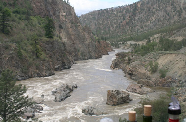 12:05 Confluence of Thompson & Fraser Rivers: Just after Lytton the train curves to the left over a bridge across the Fraser River. The confluence of Thompson & Fraser rivers is now on the right.