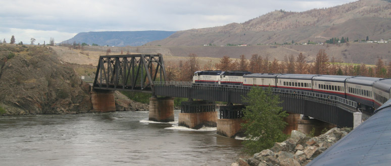 Canadian National or Canadian Pacific? Between Kamloops & Vancouver, the 1885 Canadian Pacific (CP) and the later 1917 Canadian National (CN) trans-continental routes run parallel, usually on opposite sides of the river. For the first 58 miles west of Kamloops, the Rocky Mountaineer uses CN tracks in both directions, but between Basque and Vancouver there is 'directional running' where CN & CP co-operate, sending all westbound trains including the westbound Rocky Mountaineer down CN tracks on one side of the river, and all eastbound trains including the eastbound Rocky Mountaineer down the CP tracks on the other side. You see the same scenery, of course, from a slightly different angle, but if you really want to travel on the original 1885 CP tracks (almost) all the way between Vancouver and Banff, you'll need to take an eastbound Rocky Mountaineer.