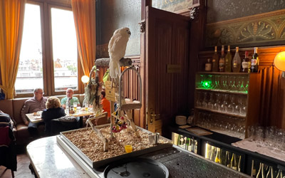 Elvis is in the house! Above left, Elvis the cockatoo on the bar at the Grand Kafe 1e Klas. Above right, a Dutch uitsmijter, the perfect lunch, a sort of deconstructed omelette with ham & cheese. Or how about a Wiener schnitzel? For dinner, prawns in olive oil and the Flanders stew hit the spot.