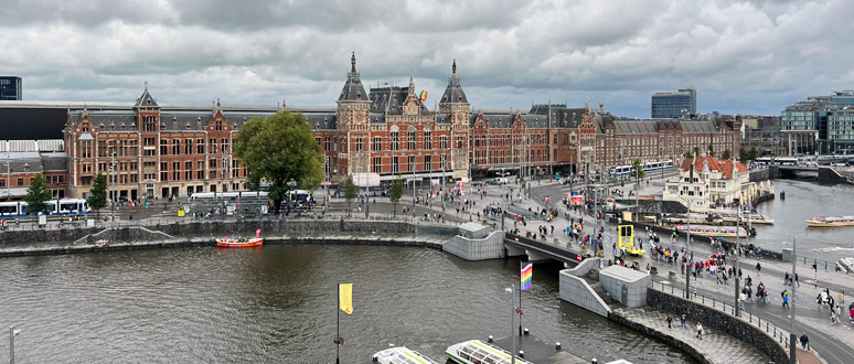 Amsterdam Centraal taken from the 6th floor of the Park Plaza Victoria Hotel. Note the tram platforms on both sides of the forecourt (Tram 2 for the Rijksmuseum & Van Gogh Museum goes from the platforms on the left). The cream building on the right houses the GVB ticket office selling GVB bus, metro, tram tickets. Larger photo.