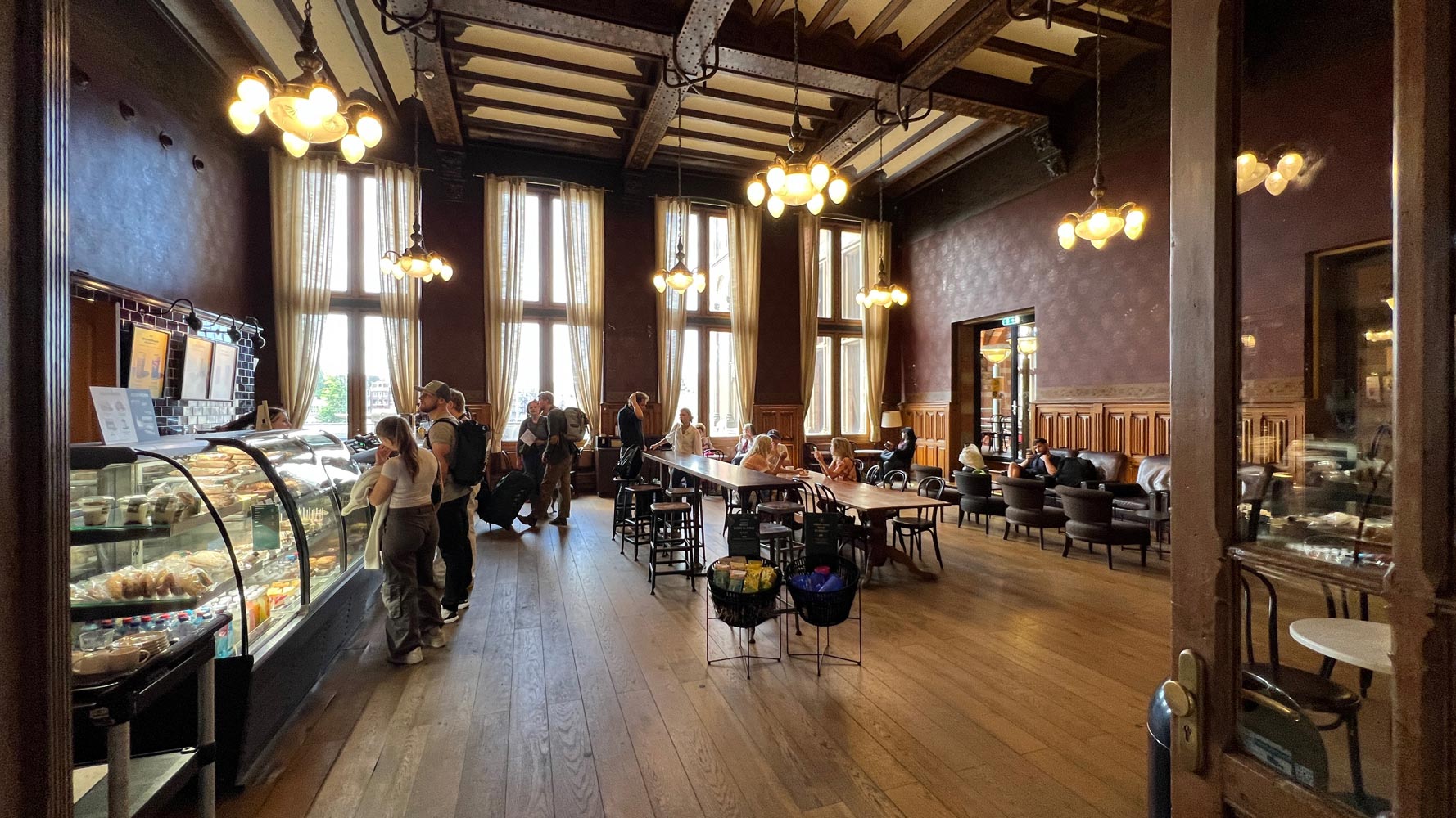 To reach the cafe from the main station entrance hall, look for an easy-to-miss set of stairs in the far right-hand corner of the main entrance hall, to the right of the row of ticket gates in front of you. The cafe is one floor up, at platform level. You'll see some historic tiling, the cafe is located in the former 1st class restaurant.