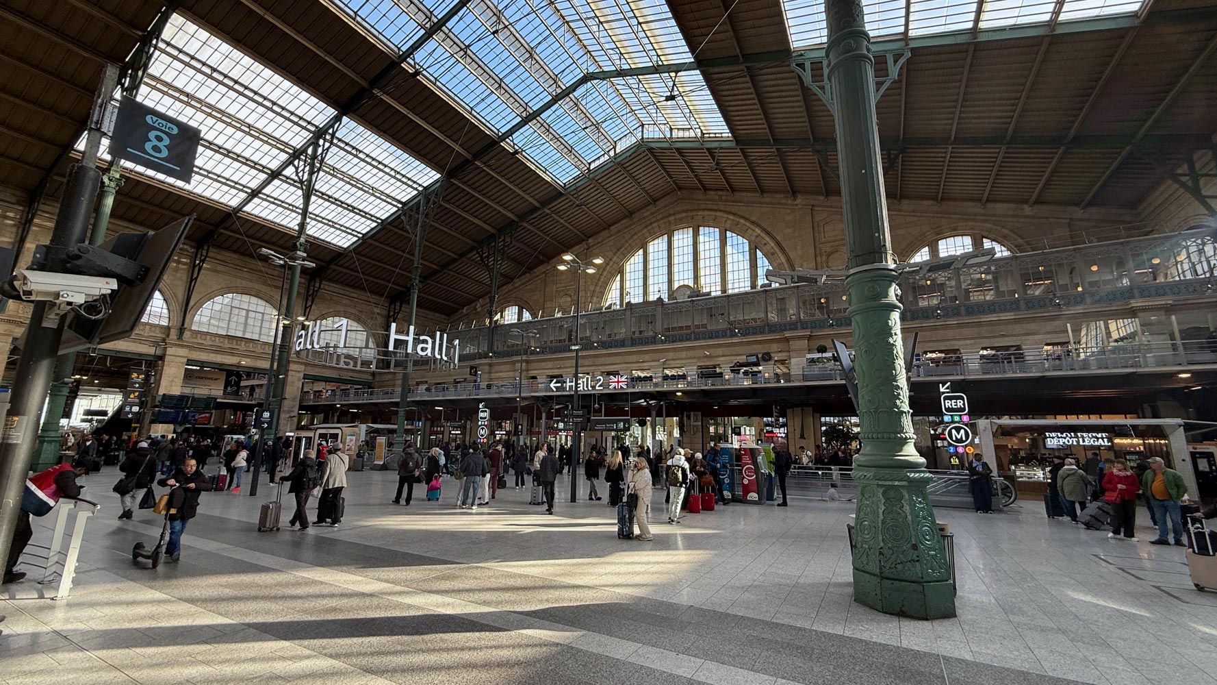 The station is marked up as 4 halls: Hall 1 is the main concourse served by platforms 1-19. Hall 2 is the balcony upstairs leading to the Eurostar check-in for trains to London. Hall 3 is the eastern side concourse served by platforms 20-21 & 30-36 used by TER & suburban trains. Hall 4 is downstairs on the eastern side of the station leading to the RER platforms. For trains to Lille, Brussels, Amsterdam, Cologne you want Hall 1. For London, Hall 2.