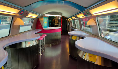 Infinita Bistro in car 1, seats arranged 2+1 across the car width. A light meal is included, breakfast is shown above left.