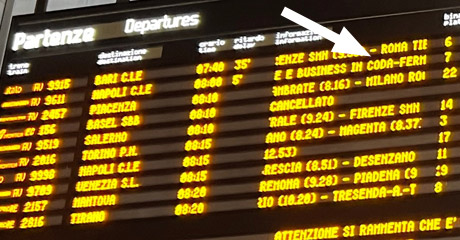 There are two ways to find your car and seat. One is to wait until the train arrives and run up & down like a headless chicken. The better way is to look at the main departures board, this usually has a scrolling panel which says either Executive e Business in Coda (at the rear) or Executive e Business in Testa (at the front), see the photo below. You now know which way round the train is, and obviously standard class will be at the other end from Executive. Once on the platform, look for the indicator screens suspended from the ceiling, these tell you where each car will stop along the platform, see the photo below.