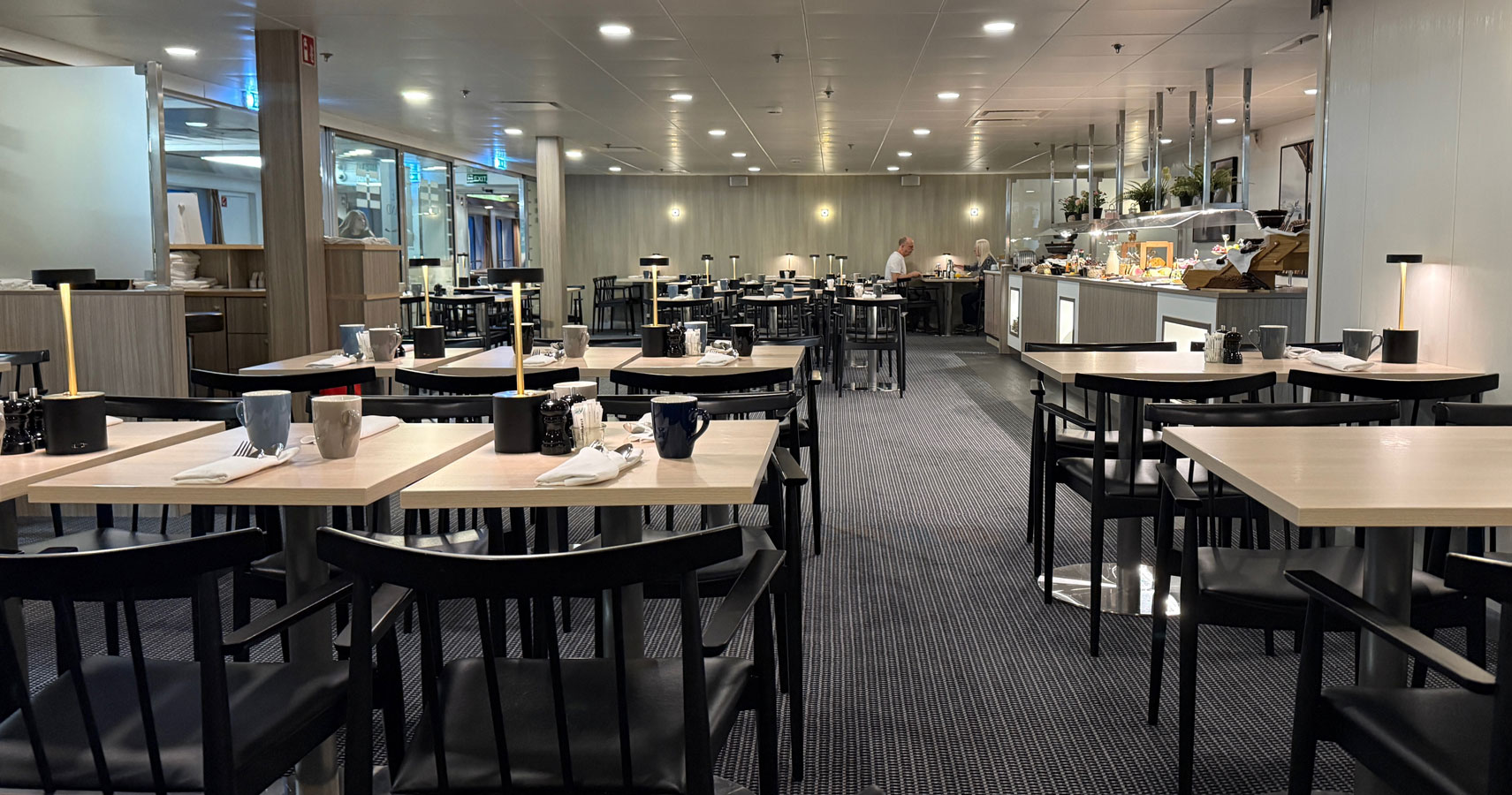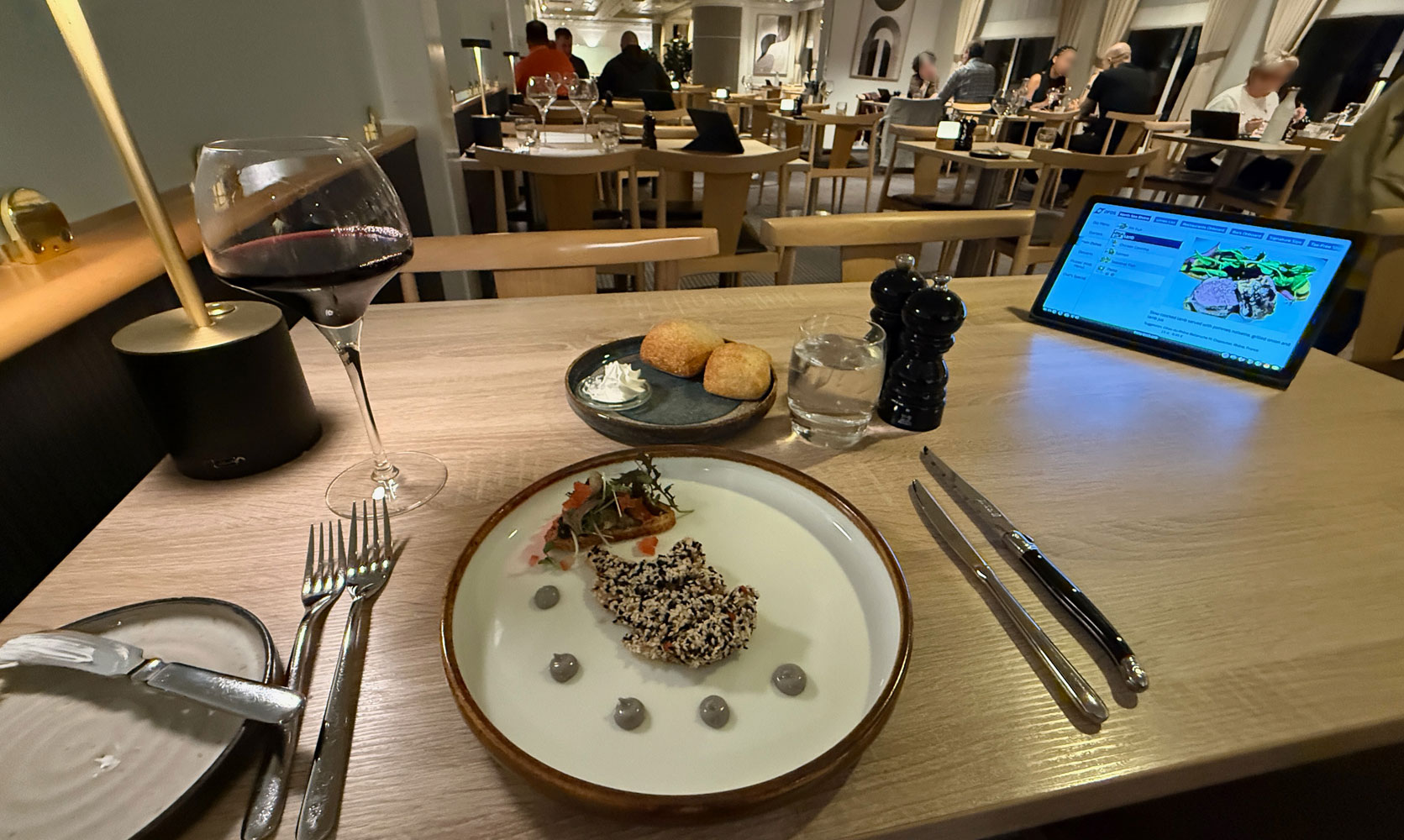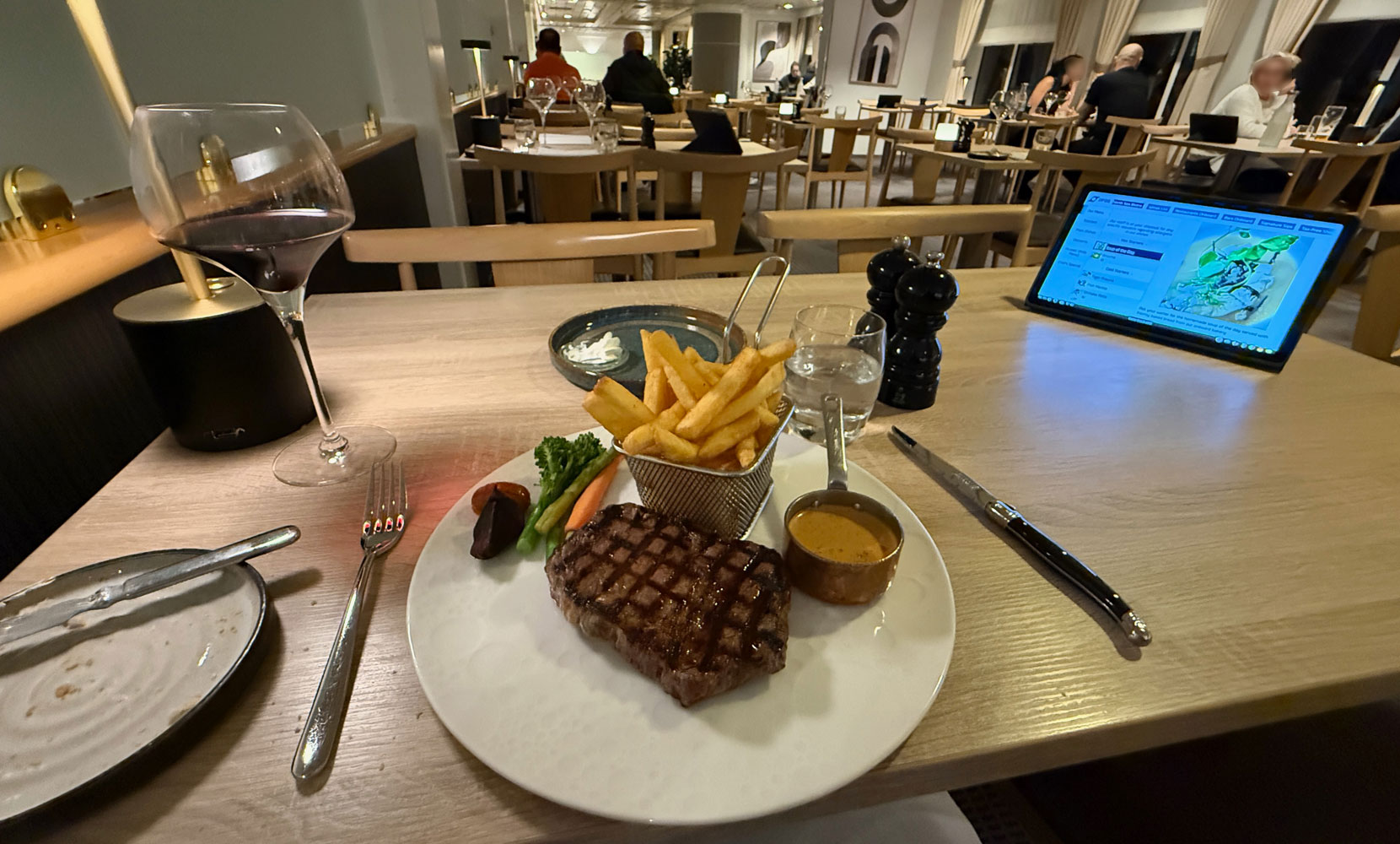 Dinner in the waiter-service North Sea Bistro. About as far from Ryanair as you can get.