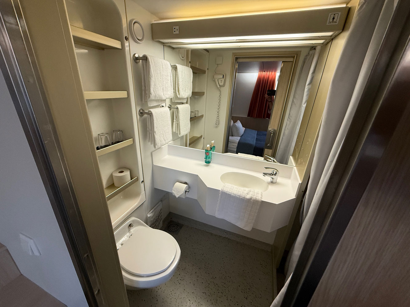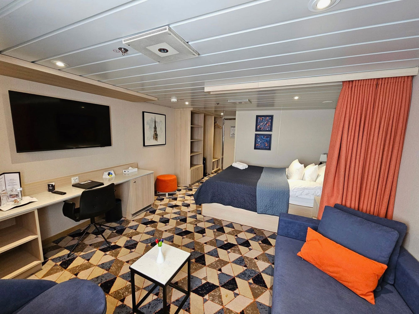 Commodore Class: Double bed plus one extra berth, window, flat-screen TV, hairdryer, seating area, complimentary minibar, WiFi included, breakfast included.