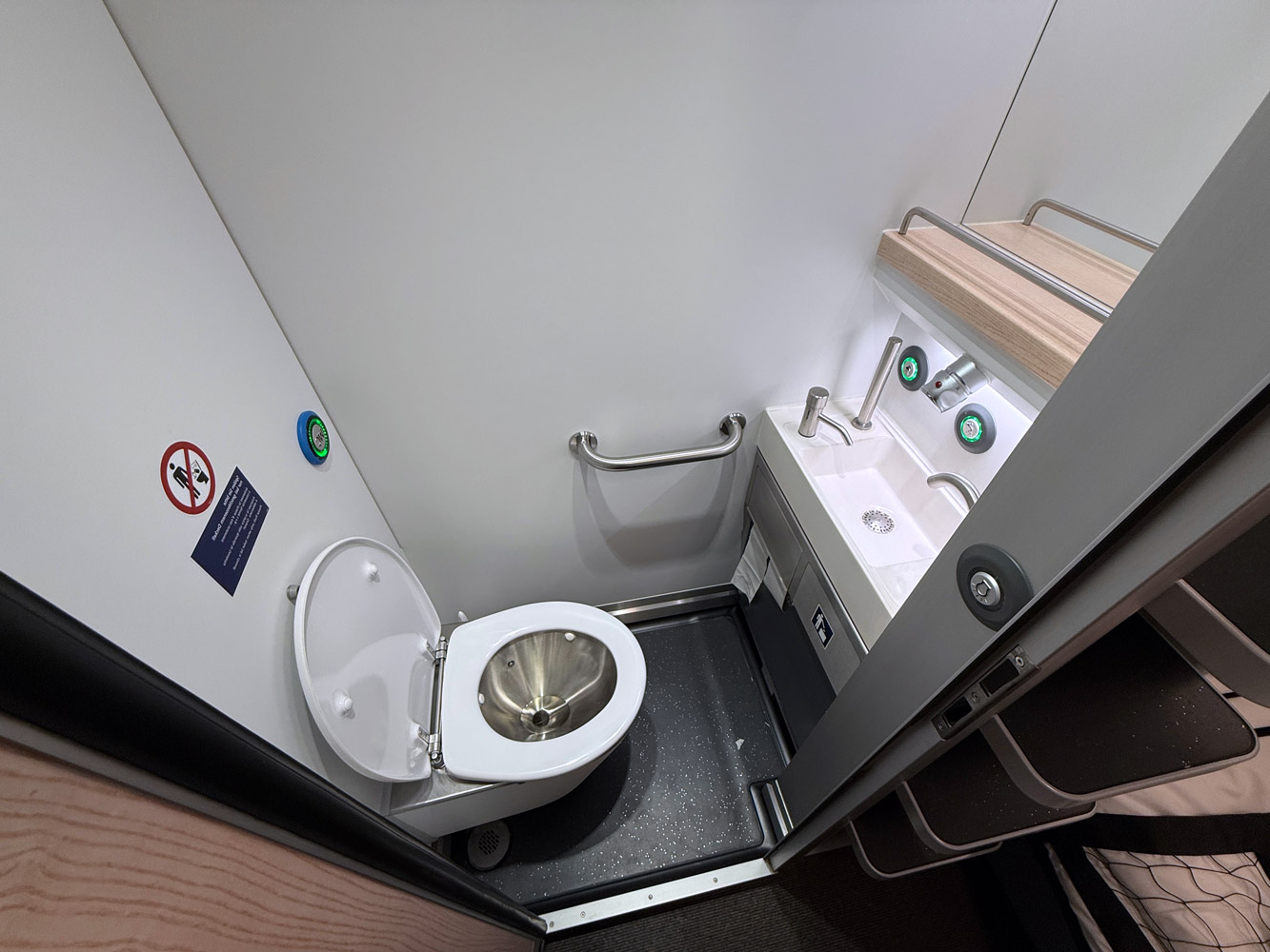 There are 2 toilets and a washroom at one end of the corridor, your control panel shows whether each toilet & washroom are free or occupied. There's a tip-up seat in the corridor if you want to sit outside your mini cabin. A light breakfast is included, 2 rolls, jam & coffee.