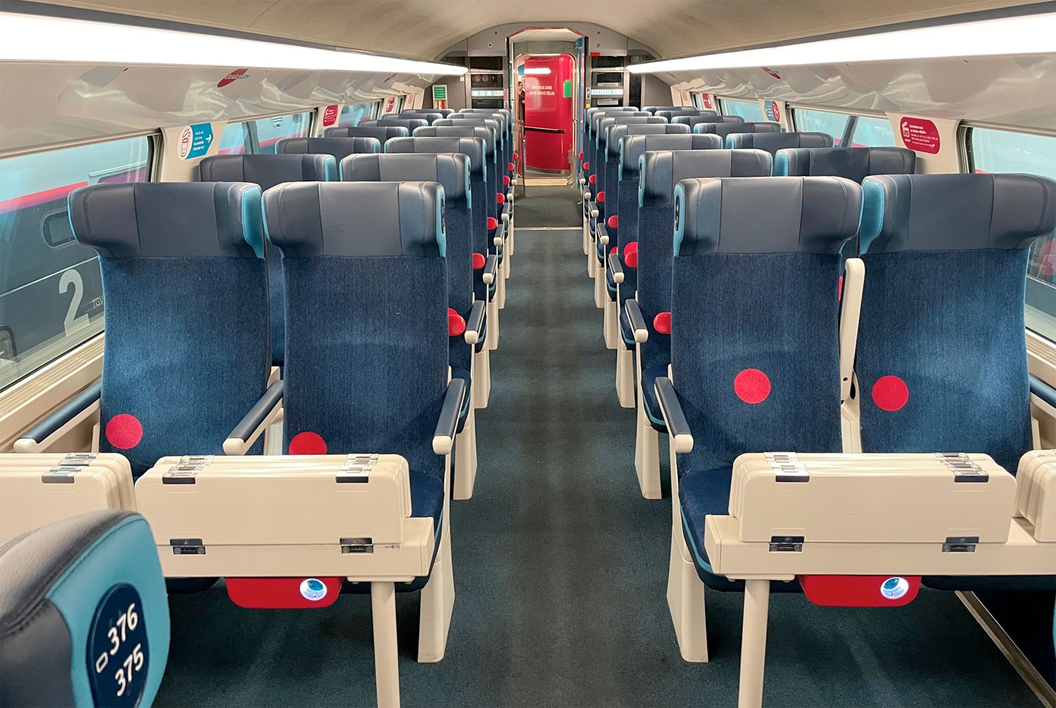 The 3-abreast seats exist downstairs in cars 1-3, where the aisle 'trough' in the floor of these former 1st class cars was offset to one side. In the former 2nd class cars (cars 5-8), seats are 2+2 both upstairs and downstairs.