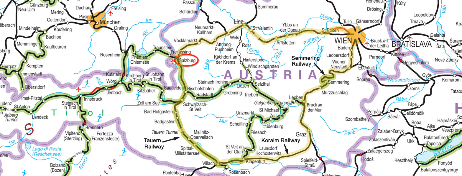 Highlighted = Vienna-Salzburg, either main line via Linz or the scenic route via Graz. Green = scenic. Red = high-speed line.