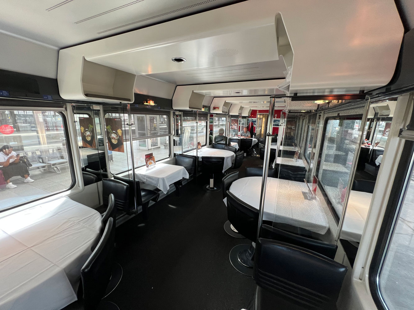 1st class has reclining leather seats arranged 2+1 across the car width, with tables for 2, tables for 4 people and some unidirectional seats. There are power sockets & tables at all seats. Food & drink orders are taken from the restaurant menu & served at your seat, at extra cost. See panorama photo. See seat map.